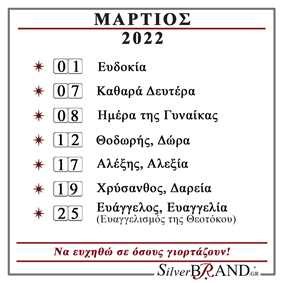 Διαβάστε το Εορτολόγιο του Μαρτίου 2022 και ευχηθείτε σε όσους γιορτάζουν.