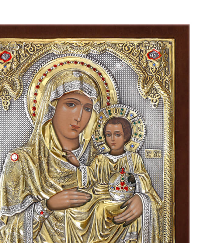 Ακριβές αντίγραφο Βυζαντινής Ασημένιας εικόνας που απεικονίζει την Παναγία Ιεροσολυμίτισσα. Κατασκευάζεται με σεβασμό στην παράδοση και έμφαση στην ποιότητα σε επιλεγμένο ελληνικό εργαστήριο από ασήμι 925o, με τοπικές επιχρυσώσεις από χρυσό 24k.