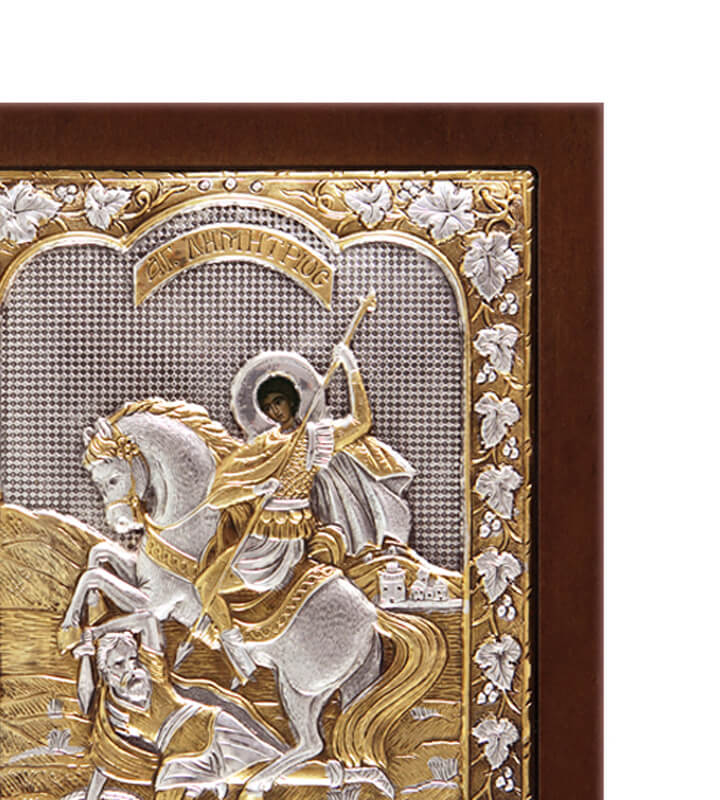 Ακριβές αντίγραφο Βυζαντινής Ασημένιας εικόνας που απεικονίζει τον Άγιο Δημήτριο. Κατασκευάζεται με σεβασμό στην παράδοση και έμφαση στην ποιότητα σε επιλεγμένο ελληνικό εργαστήριο από ασήμι 925o, με τοπικές επιχρυσώσεις από χρυσό 24k.
