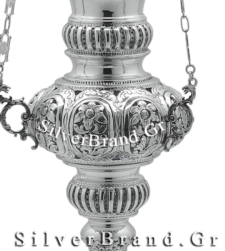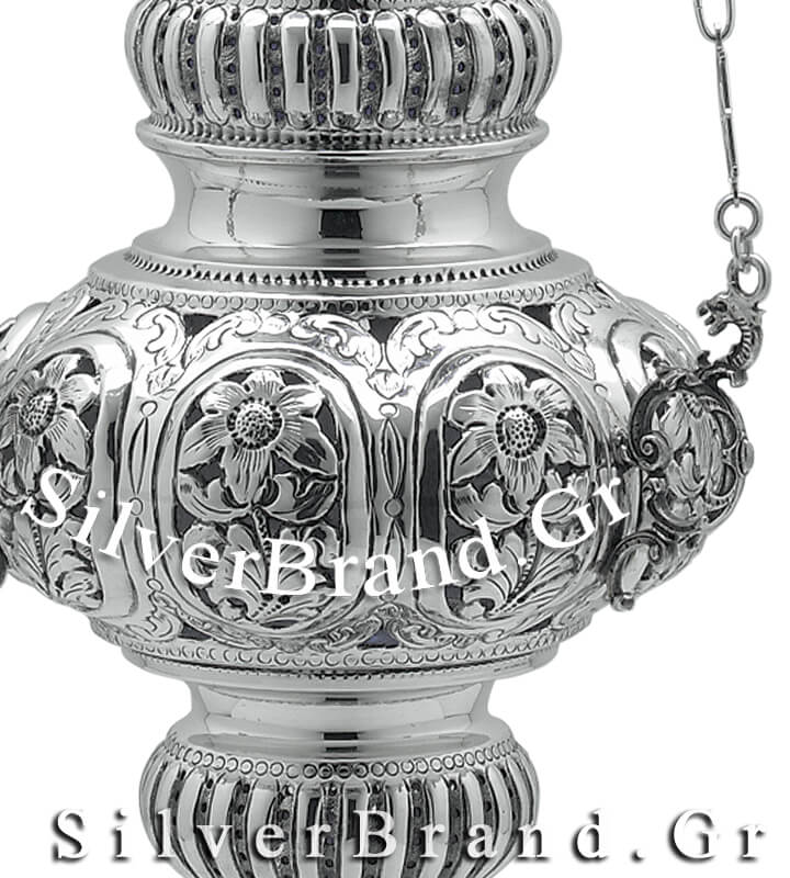 Ασημένιο καντήλι, με ανάγλυφα χειροποίητα σκαλίσματα και ασημένια αλυσίδα, σχέδιο: Πάτμου Μαργαρίτα μεγάλο. Όλα τα εκκλησιαστικά σκεύη σχεδιάζονται και κατασκευάζονται στην Ελλάδα με σεβασμό στην παράδοση και σύμφωνα πάντα με τους κανόνες της Ορθόδοξης Εκκλησίας, από καθαρό ασήμι 925o, δίνοντας έμφαση στην υψηλή ποιότητα.