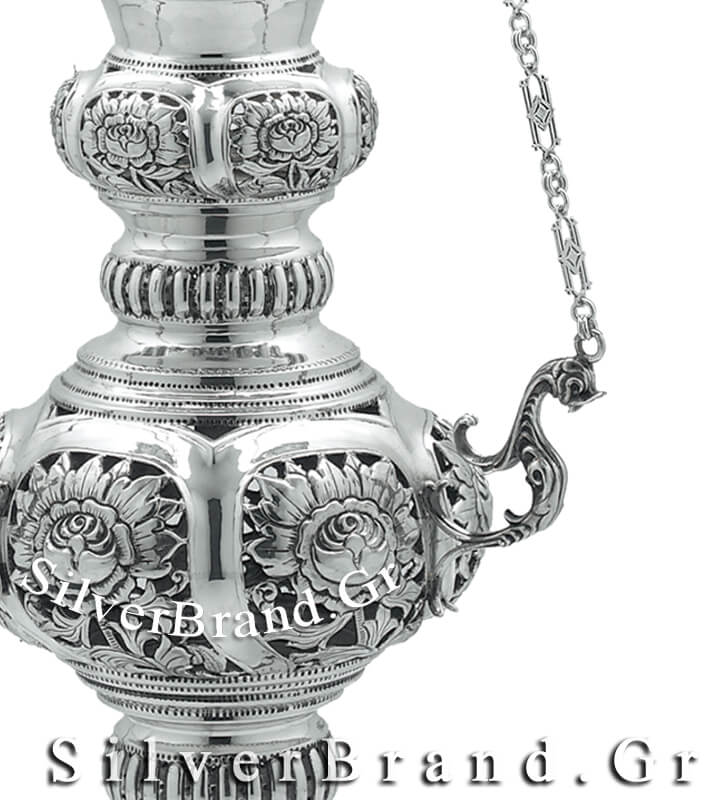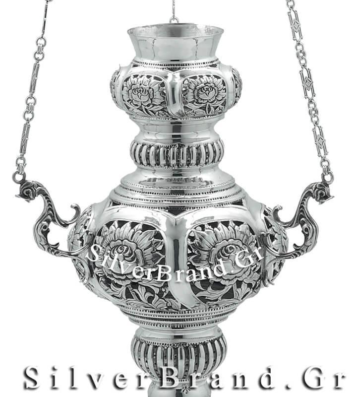 Ασημένιο καντήλι, με ανάγλυφα χειροποίητα σκαλίσματα και ασημένια αλυσίδα, σχέδιο: Τριαντάφυλλο πολύ μεγάλο.Όλα τα εκκλησιαστικά σκεύη σχεδιάζονται και κατασκευάζονται στην Ελλάδα με σεβασμό στην παράδοση και σύμφωνα πάντα με τους κανόνες της Ορθόδοξης Εκκλησίας, από καθαρό ασήμι 925o, δίνοντας έμφαση στην υψηλή ποιότητα.