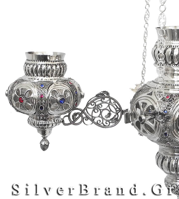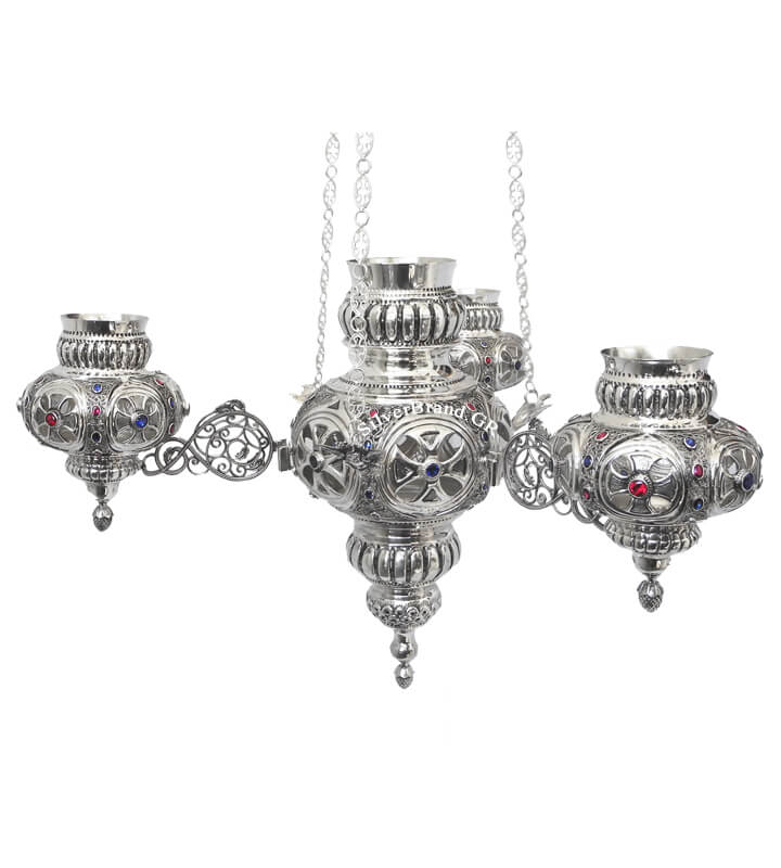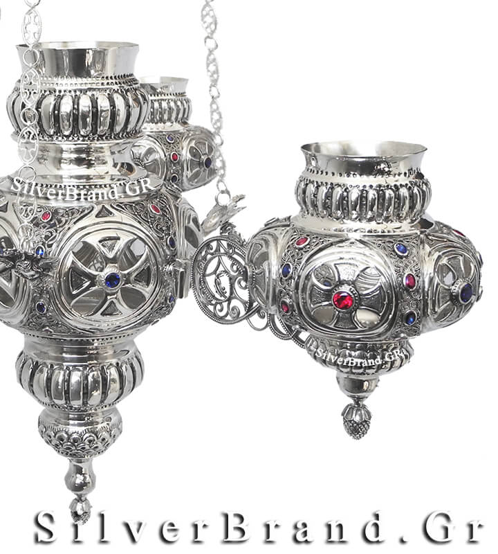 Ασημένιο πολυκάντηλο, με ανάγλυφα χειροποίητα σκαλίσματα και ασημένια αλυσίδα, σχέδιο: Σταυρούς & με 126 πέτρες. Αποτελείται από 3+1 καντήλια.Το κεντρικό καντήλι έχει ύψος 34cm και τα περιφερειακά 17cm.Όλα τα εκκλησιαστικά σκεύη σχεδιάζονται και κατασκευάζονται στην Ελλάδα με σεβασμό στην παράδοση και σύμφωνα πάντα με τους κανόνες της Ορθόδοξης Εκκλησίας, από καθαρό ασήμι 925o, δίνοντας έμφαση στην υψηλή ποιότητα.