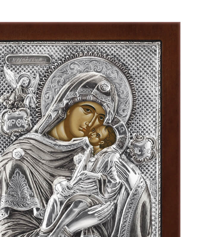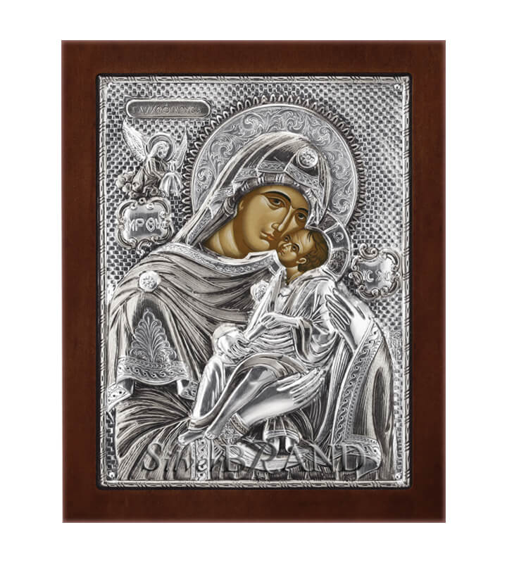 Exact copy of byzantine silver icon depicting Virgin Mary. Manufactured, with respect for tradition and attention to quality, exclusively in our workshop in Greece. Made of silver 925o.Silver has been specially treated to preserve its shine and to remain unchanged in time.The Face of Virgin Mary and Christ have colors of hagiography printed on canvas.The icon is presented in brown wood with a wooden standing base and an insert to hang it on the wall.Each icon has a silver certification seal 925o and it is offered in a luxurious gift box.Offered as a wedding, baptism or name day gift. A timeless gift never losing its value.
