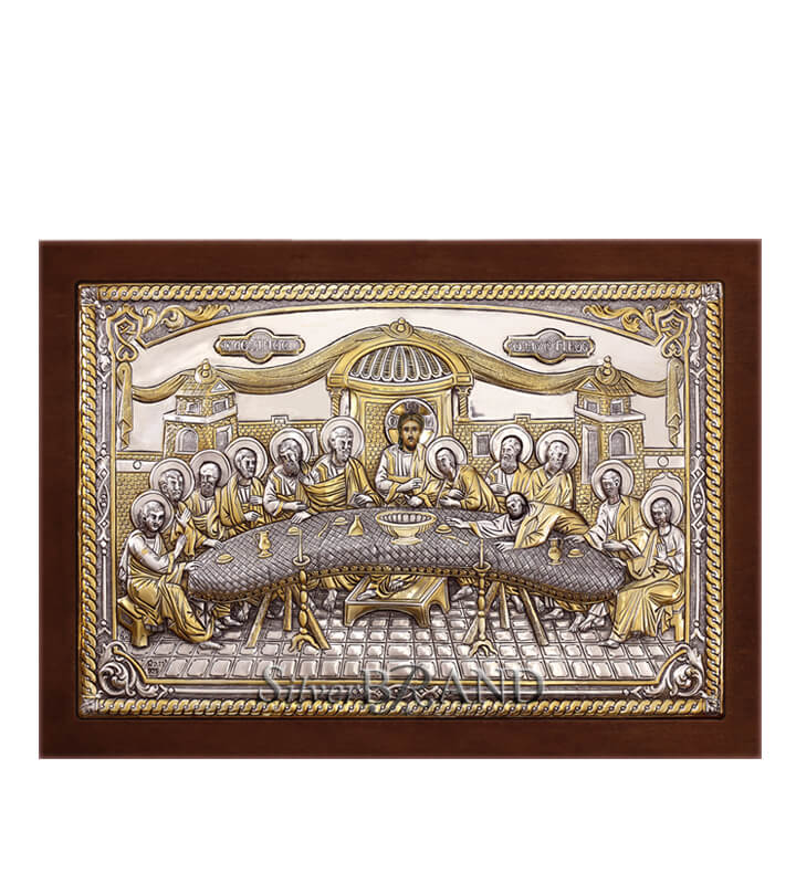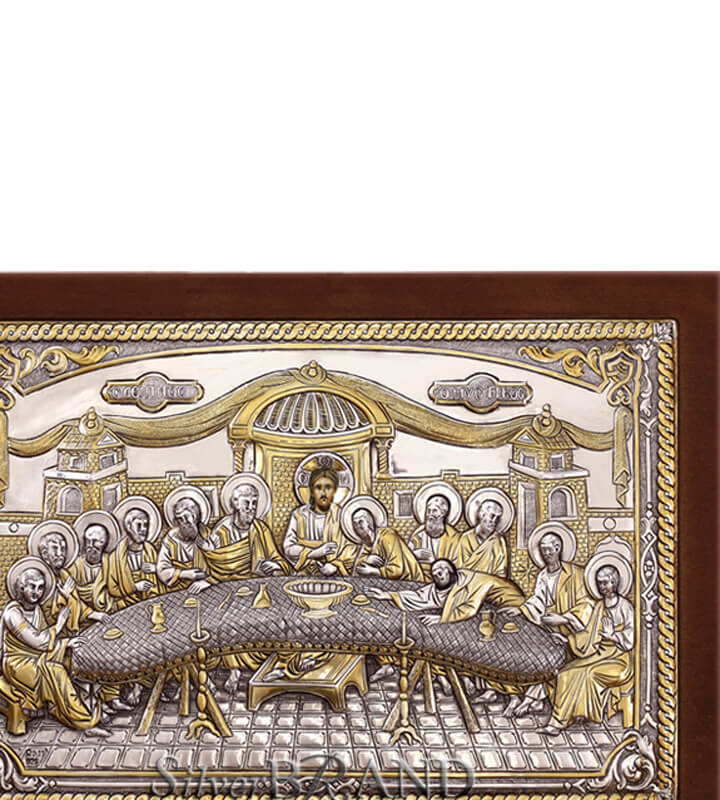 Exact copy of byzantine silver icon depicting the Last Supper. Manufactured, with respect for tradition and attention to quality, exclusively in our workshop in Greece. Made of silver 925o partially gold plated with gold 24k.Silver has been specially treated to preserve its shine and to remain unchanged in time.The Face of Christ has colors of hagiography printed on canvas.The icon is presented in brown wood with an insert to hang it on the wall.Each icon has a silver certification seal 925o and it is offered in a luxurious gift box.Offered as a wedding, baptism or name day gift. A timeless gift never losing its value.