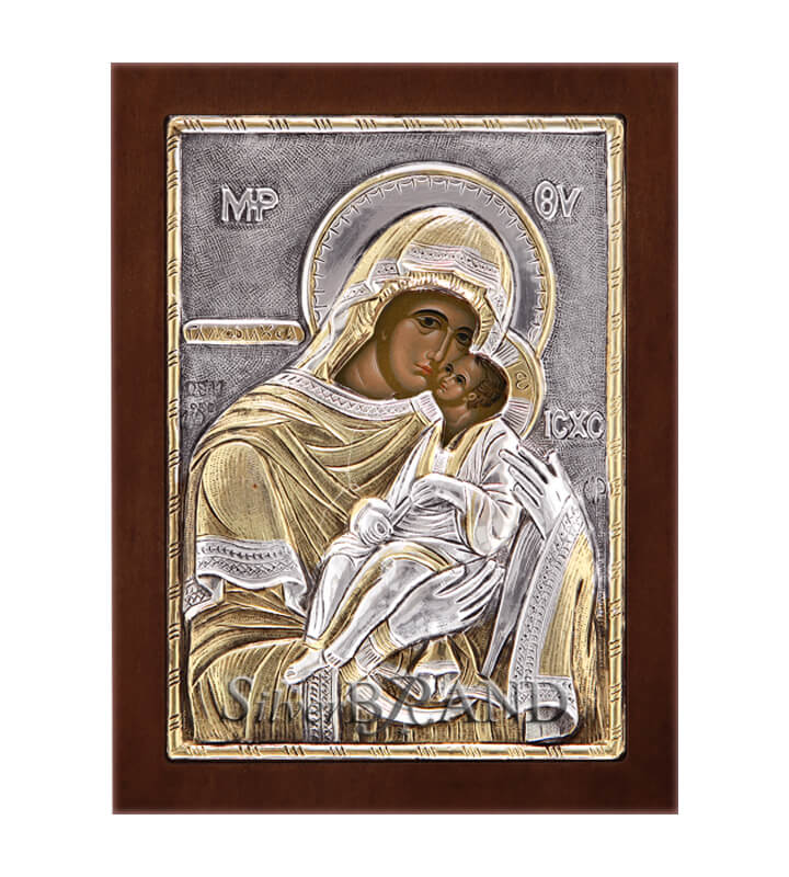 Exact copy of byzantine silver icon depicting Virgin Mary. Manufactured, with respect for tradition and attention to quality, exclusively in our workshop in Greece. Made of silver 925o partially gold plated with gold 24k. Silver has been specially treated to preserve its shine and to remain unchanged in time. The Face of Virgin Mary and Christ have colors of hagiography printed on canvas. The icon is presented in brown wood with a wooden standing base and an insert to hang it on the wall. Each icon has a silver certification seal 925o and it is offered in a luxurious gift box. Offered as a wedding, baptism or name day gift. A timeless gift never losing its value.