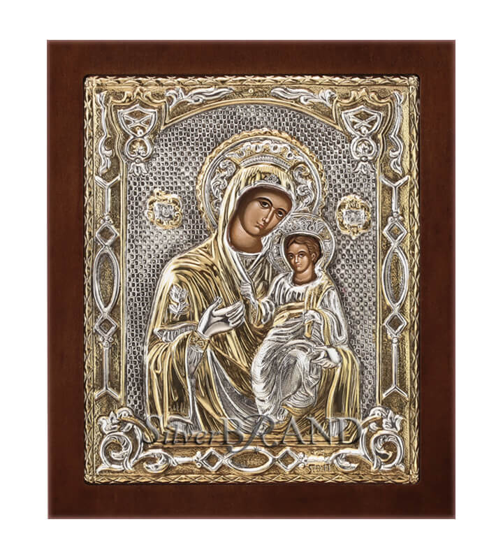 Exact copy of byzantine silver icon depicting Virgin Mary. Manufactured, with respect for tradition and attention to quality, exclusively in our workshop in Greece. Made of silver 925o partially gold plated with gold 24k. Silver has been specially treated to preserve its shine and to remain unchanged in time. The Face of Virgin Mary and Christ have colors of hagiography printed on canvas. The icon is presented in brown wood with a wooden standing base and an insert to hang it on the wall. Each icon has a silver certification seal 925o and it is offered in a luxurious gift box. Offered as a wedding, baptism or name day gift. A timeless gift never losing its value.